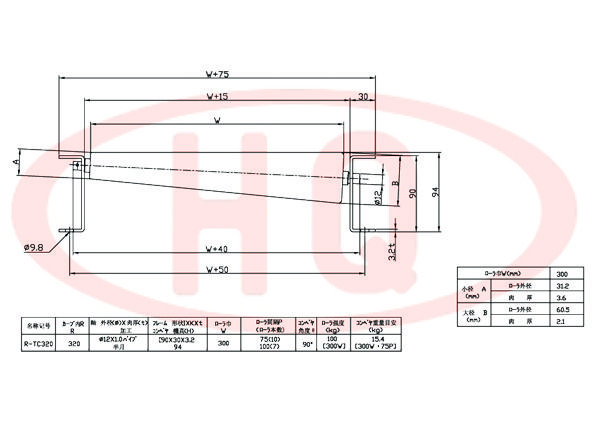 | 型 號 | 轉彎半徑 R | 軸外徑(φ)×壁厚(t) 加工 | 支架形狀I×K×t 輸送機高(H) | 滾筒幅寬 W | 滾筒間距 P (滾筒數) | 輸送機 角度 θ | 滾筒強度 (kg) | 輸送機重量 (kg) | ||||